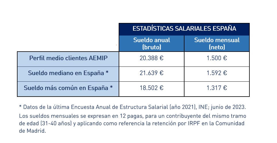 Según se desprende de la estadística elaborada por AEMIP, el perfil medio del cliente responde a las siguientes características: si lo agrupamos por tramos de edad, el más significativo es el de 31 a 40 años, aunque los tramos de edad anterior (22-30) y posterior (41-50) también representan unos porcentajes no muy inferiores. Cuenta con unos ingresos mensuales que rondan los 1.500 euros, no tiene un estado civil predominante y, en la mitad de los casos, tiene hijos a su cargo.